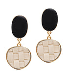 Unique black and white earrings with faux leather woven on white area of earrings. 1x2 inches