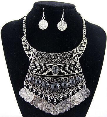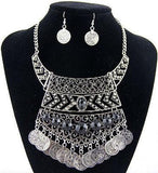Silver tone necklace with coin accents and matching earrings